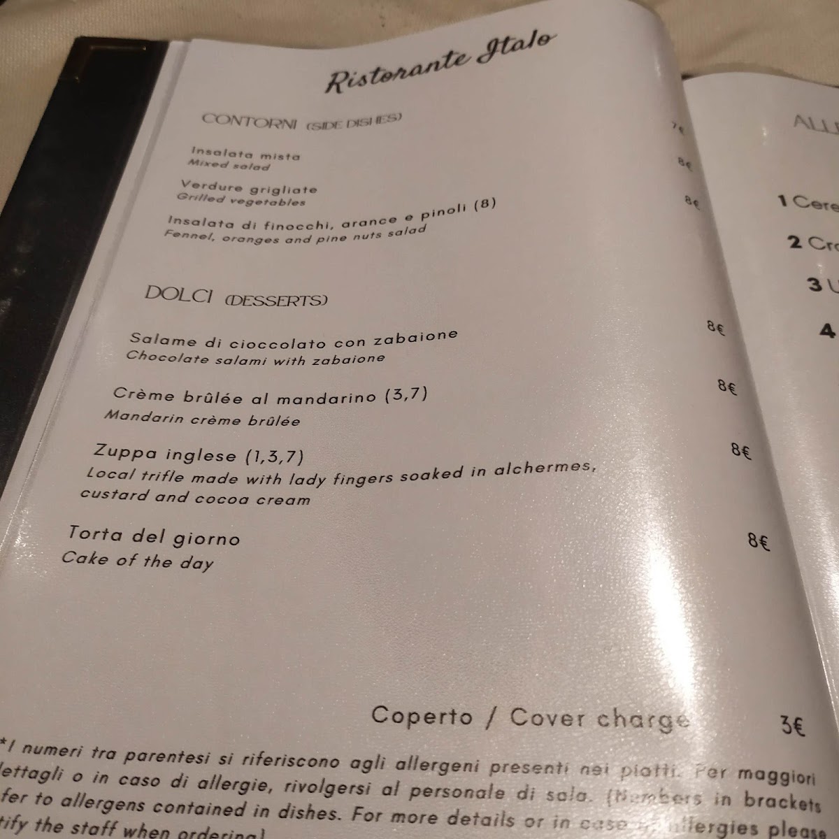 The Contorni selection features simple yet flavorful sides, including a fresh Insalata mista, grilled Verdure grigliate, and a vibrant Insalata di finocchi, arance e pinoli, fennel salad with oranges and pine nuts.